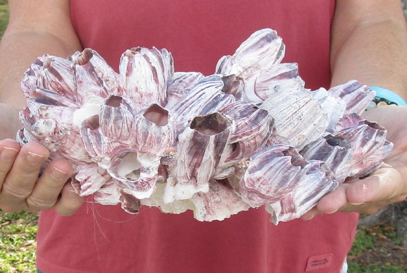 Large Purple Barnacle Cluster for Sale measuring approximately 10 inches long, 7-1/2 inches wide and 5 inches high.  No two will be identical.  Purple Barnacles will vary greatly in shape, size and shading. These large barnacle clusters are created by gluing smaller barnacles together. Our supplier uses a PINK colored glue and it will be visible in spots on the cluster.   Large barnacles are used in seashell decor, for displaying airplants and are an excellent hiding place for small fish and are a colorful accent to the fish tank; However, a salt water fish expert must be consulted for details on how to introduce barnacles into a tank.