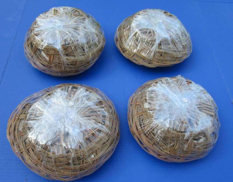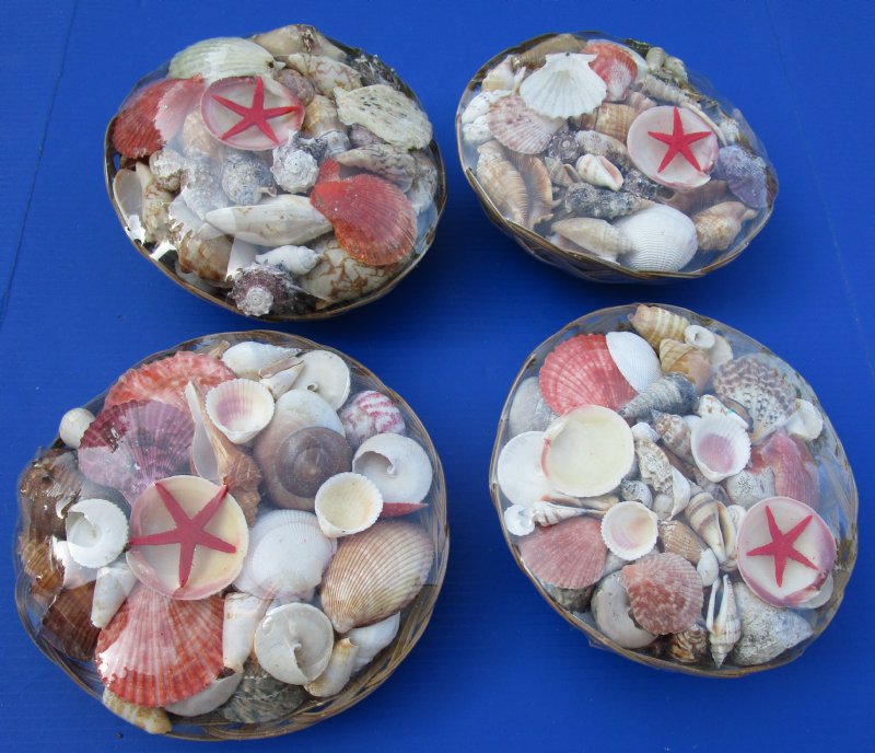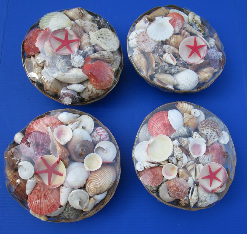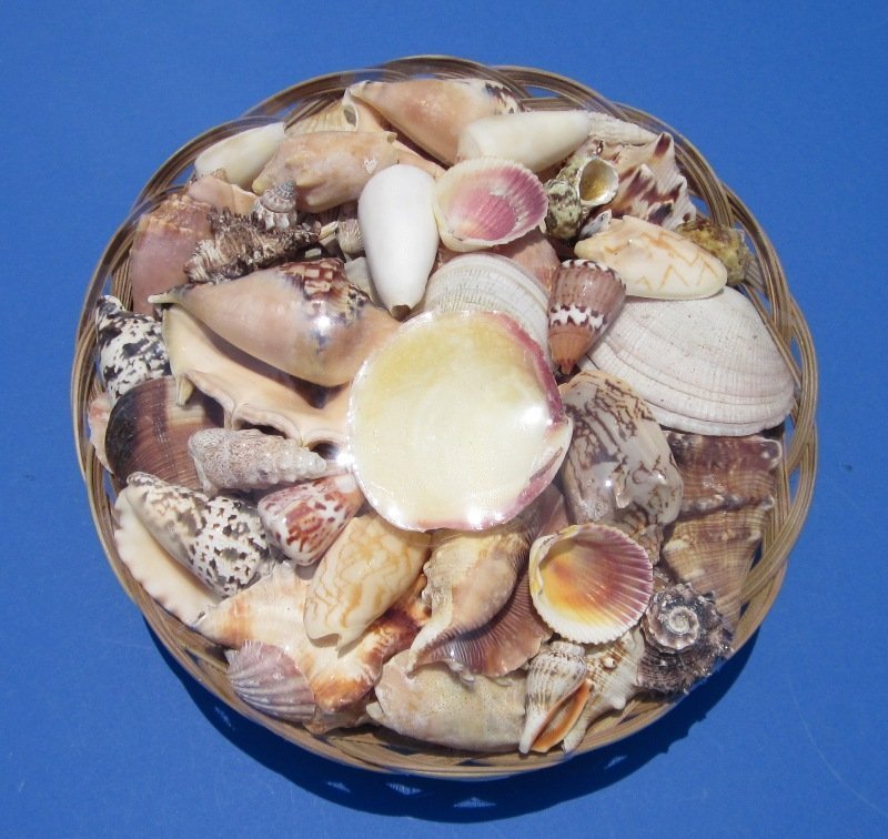 10 inches large round basket of seashells for displaying on a table or giving as a gift, weighing approximately 3 pounds each.  Our 10 inches large round baskets of seashells are woven out of rattan and filled with assorted seashells including small conch shells, murex, melon shells, turban shells, lambis shells, scallop shells, pectens, clams, cone shells, cowries, land snails, turritella, pecten shells and many more pretty shells.  The bottoms of the baskets are primarily pectens, scallops and clam shell.  Some seashell baskets come with a starfish - some do not have a starfish.