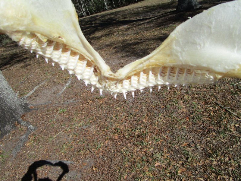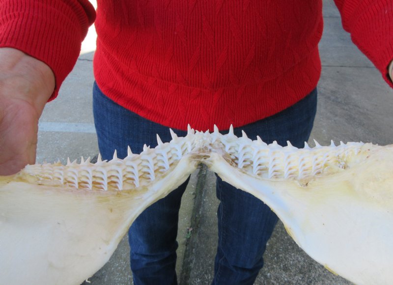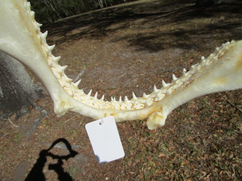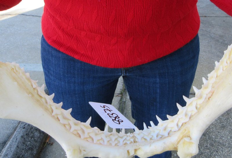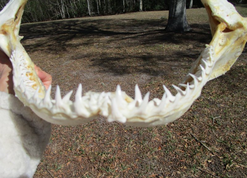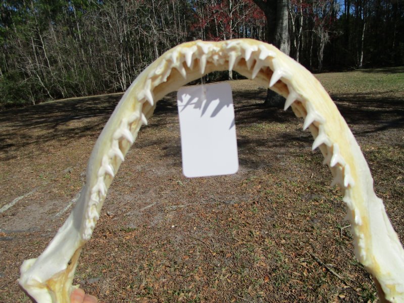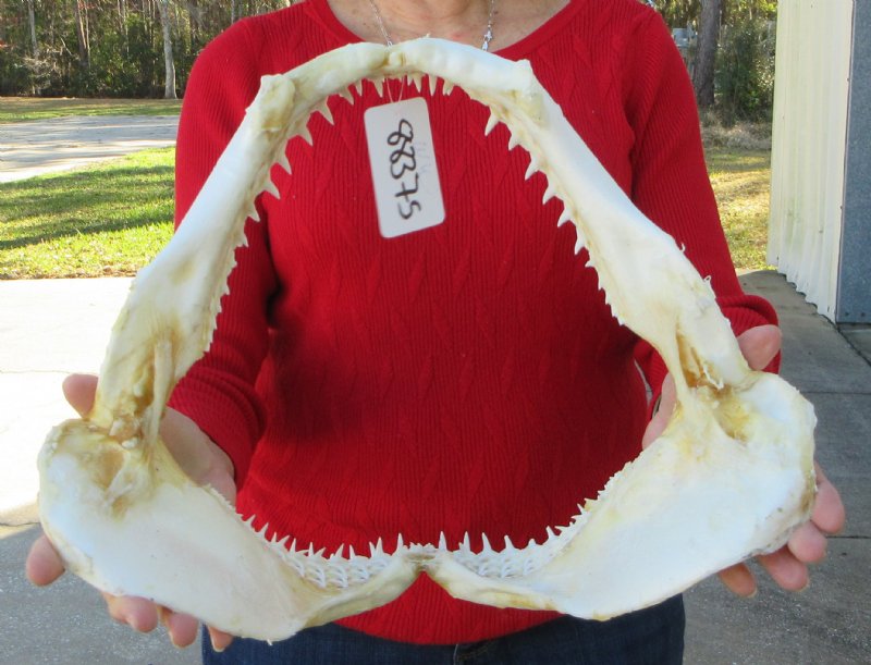 Real Blacktip Shark Jaw, with Very Sharp Teeth (Carcharhinus limbatus) measuring 15 inches wide and 12 inches high.  It has been cleaned and whitened but will have some patches of discoloration.  This blacktip shark jaw is Real - Not a Replica.  It will have cuts and scrapes on the cartilage, missing and broken teeth and will have a fishy odor.   Our shark jaws are obtained from the Indian fishing industry and are not endangered.   They have been cleared for legal entry into the US by the US Fish and Wildlife Department and US customs.