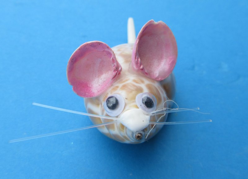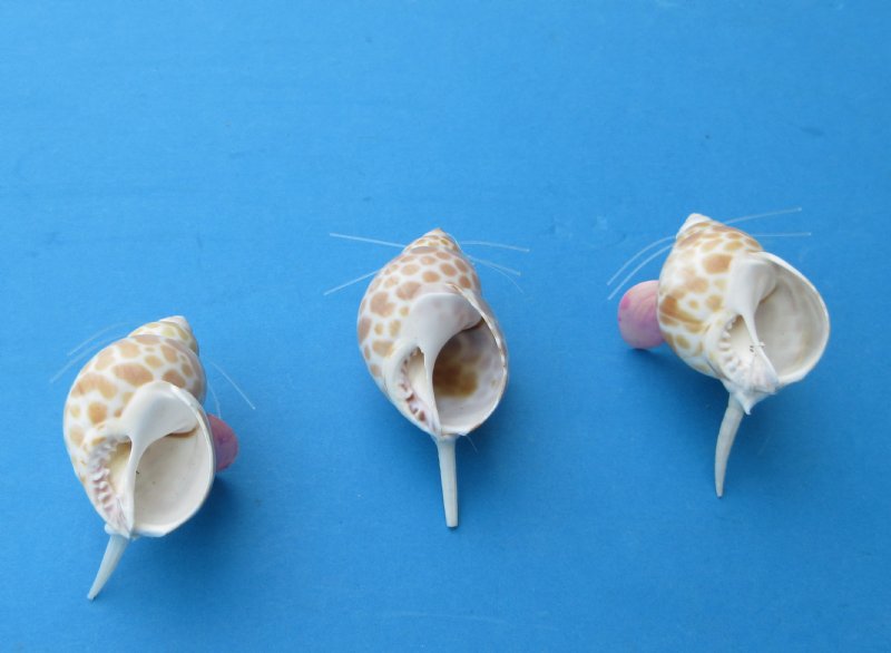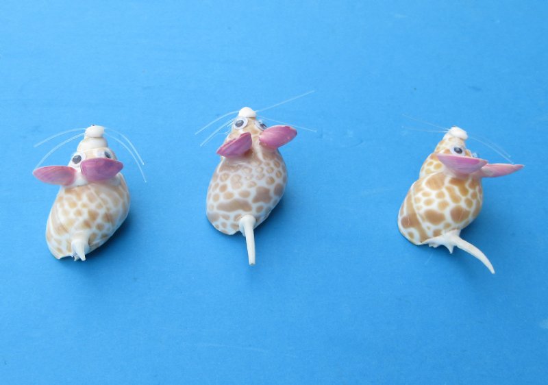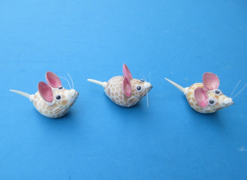 Tiny Seashell Mice Novelties measuring approximately 2 inches long and 1 inch wide.  The body of our seashell mice are made out of a babylonia spirata shells. The ears are made out of painted pink tiny clam shells, with a tiny clam shell nose and a tiny tusk shell tail.   Each one has tiny wiggly eyes. They are made out of Real Babylonia Spirata and Clam Shells - Not Imitation.  They will vary slightly in size, shape and coloring.