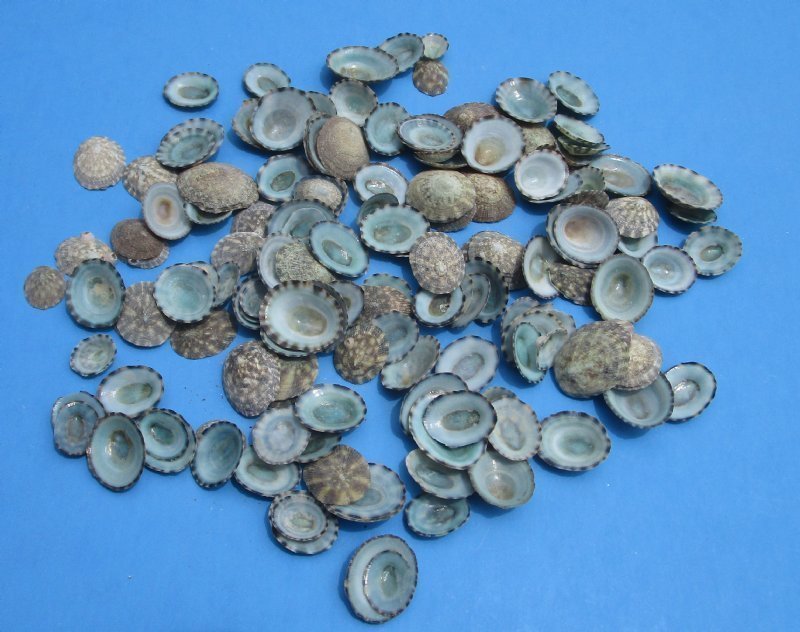 20 pound bag of Wholesale Green Limpet Shells in Bulk, Scurria mesoleuca, a small shiny teal green colored shell. Our Green limpet shells sold in bulk, are a beautiful teal colored shell with a shiny interior used in Seashell Crafts. They are also called Half-white Limpets, and measure between 1/2 inch and 1 inches (a few may be over 1 inch). The interior of the teal green limpet shells are shiny. Green limpets are popular in seashell crafts as this beautiful shell adds an attractive accent to shell mirrors, shell wreaths and ornaments. Some may be a little faded in color and not as shiny. These are real shells - not replicas. Some of the shells will have chipped edges or broken edges.