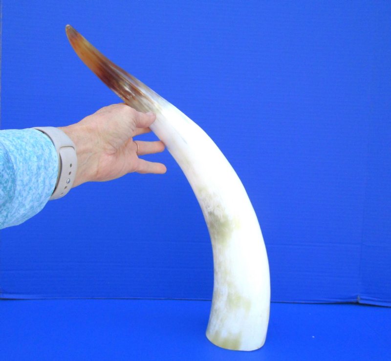 Polished White Cattle Horn, with a marble appearance, with a blend of tan, white and golden brown.  It measures between approximately 21-1/2 inches, measured around the curve of the horn using a cloth tape measureOur polished white cattle and cow horns for sale were imported from India.  This white polished water cattle horns will not stand unsupported. Buffalo horns vary in coloring, size and shape and are used for making animal horn jewelry, in cabin decor, rustic decor, as knife handle material and for cane handles, for carving, in the art of scrimshaw and in making inlaid instruments.