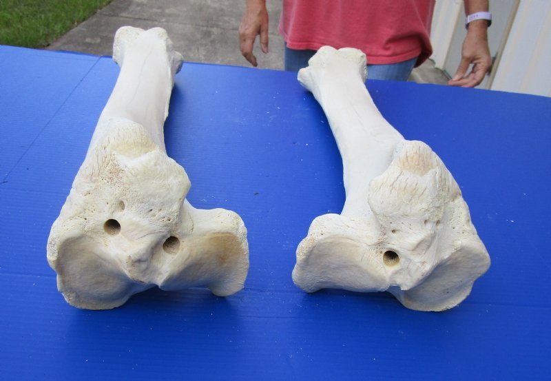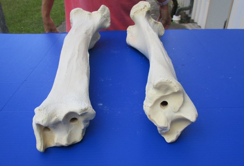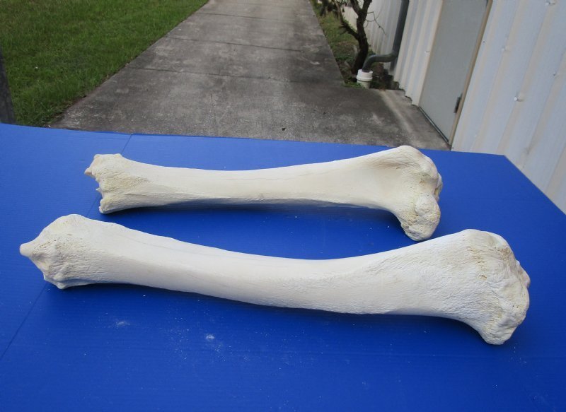 Wholesale African Giraffe Tibia Bones for Sale from the upper legs (Giraffa camelopardalis) measuring between approximately 21 inches long and 26 inches long. Our Giraffe tibia bones are 100% Real and from African giraffes - Not Replicas. They will have natural imperfections such as small cracks, chips, tiny holes, greenish/golden discoloration on the bone, etc. The giraffe tibia bones have been cleaned and whitened and are ready for display. They have been legally imported into the US and has cleared US Fish and Wildlife and US Customs.