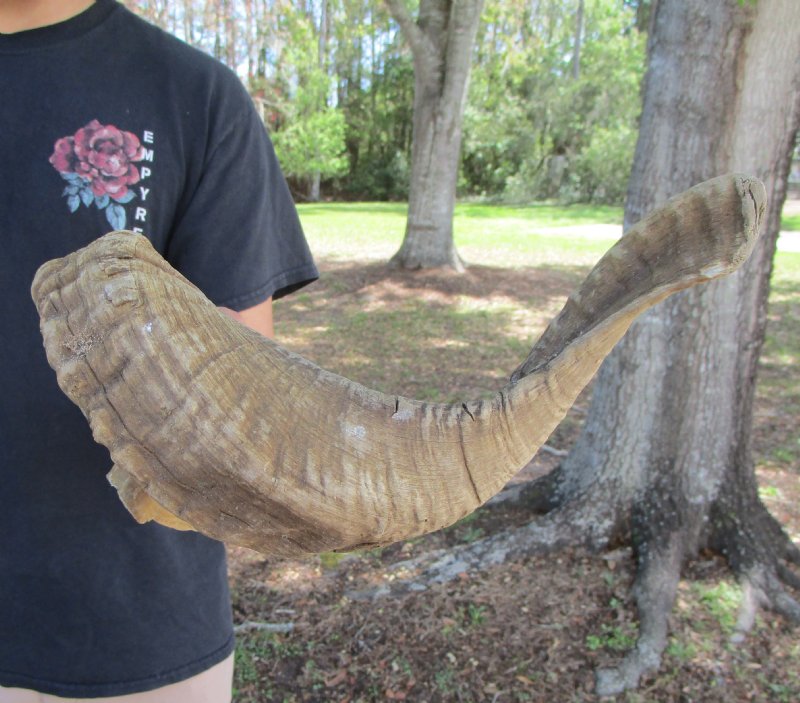 African Merino Ram, Sheep Horn for Sale, Ovis Aries, measuring approximately 26-1/2 inches, measured around the curl of the horn using a cloth tape measure. (SEE PHOTOS ) This sheep horn was imported from South Africa and sourced from the farming industry. It is Real - Not a Replica.  Some are heavier than others, depending upon the thickness of the horn.  It will have natural imperfections from fighting, aging and living in the wild.