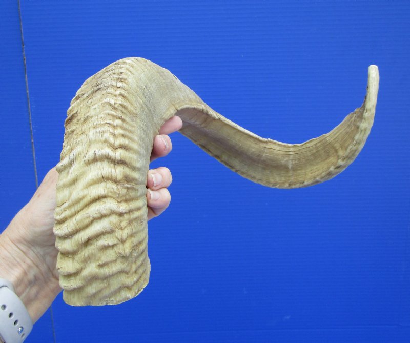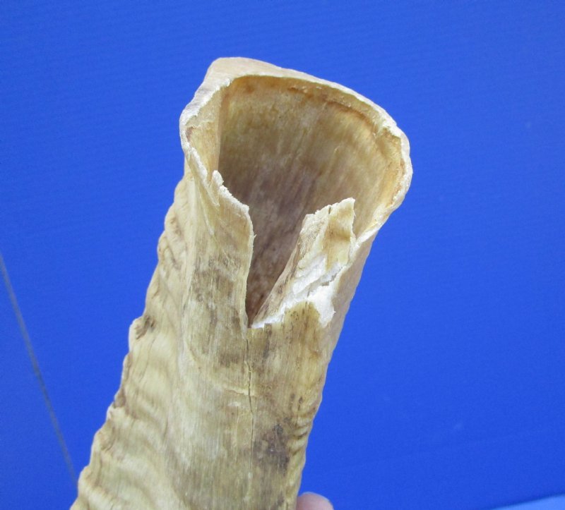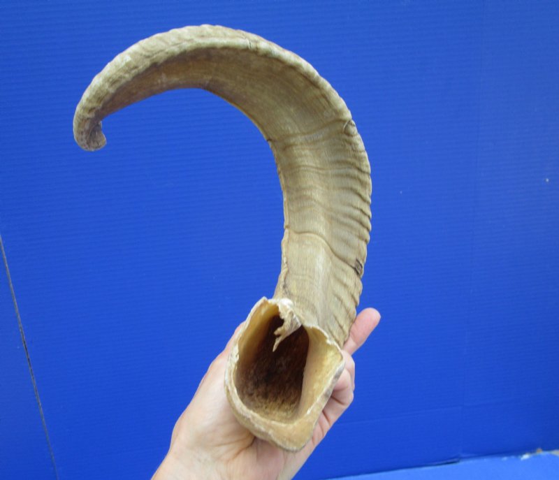 African Merino Ram Horn For Sale, or Sheep Horn for Sale, Grade B quality, Ovis Aries, measuring approximately 26 inches, measured around the curl of the horn using a cloth tape measure.  (Has a split at the mouth opening. Review all photos carefully.)