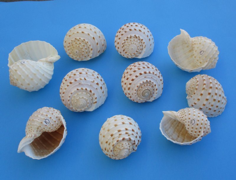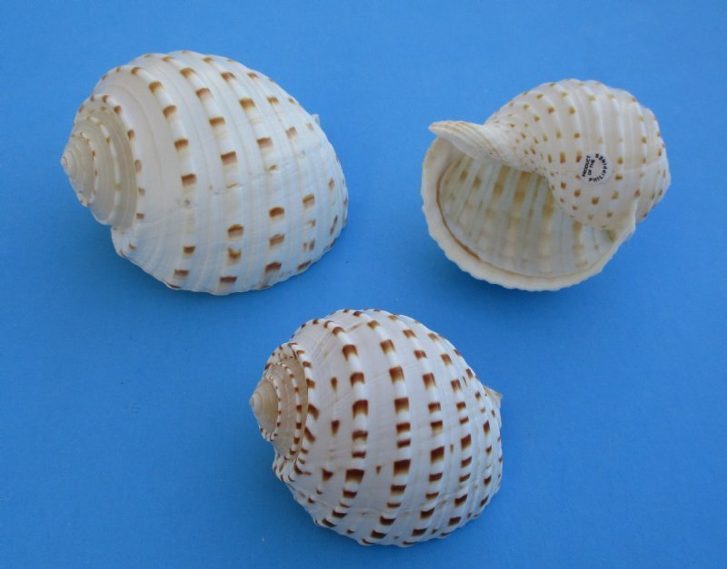 Spotted Tun Shells for Sale in bulk, Tonna dolium, also called tonna tessellata seashells for hermit crab homes measuring approximately 3 inches to 3-7/8 inches in size. Spotted tun shells are from the family Tonnidae. These shells are light weight and perfect homes for large hermit crabs, displaying air plants and for accents in shell baskets and glass containers used in seashell decor.