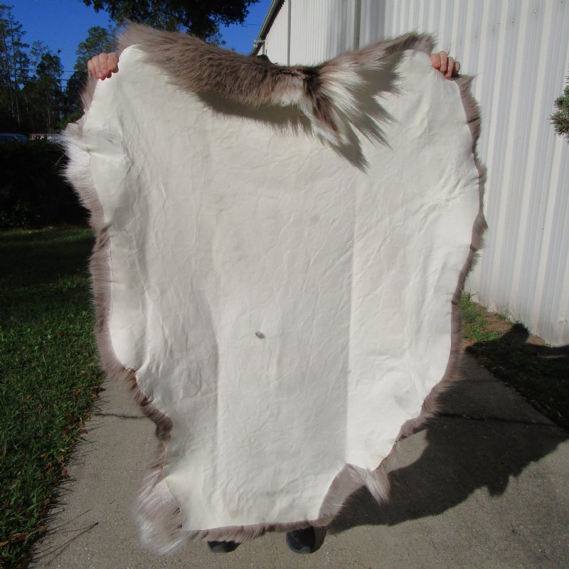 Finland Reindeer Hide, Reindeer Fur and Reindeer Skin without legs, sourced from the farming industry.  The fur has a blend of grays, browns, tans and whites.  It measures approximately 45 inches long and 34 inches wide.  This is a real reindeer hide, fur - NOT faux, imitation skin.  This is a Grade B Hide.  It has a couple blade slices on the fur and small hole in back.  Our Grade B reindeer hides, reindeer skins and reindeer furs without legs are professionally tanned and imported from Finland. The legs have been trimmed off. Reindeer hides and reindeer furs are a natural and comfortable product. They should not be walked or stepped on, to prevent shedding and breaking of the fur. Reindeer skins and hides should be cleaned once a year with a standard vacuum on the lowest power.