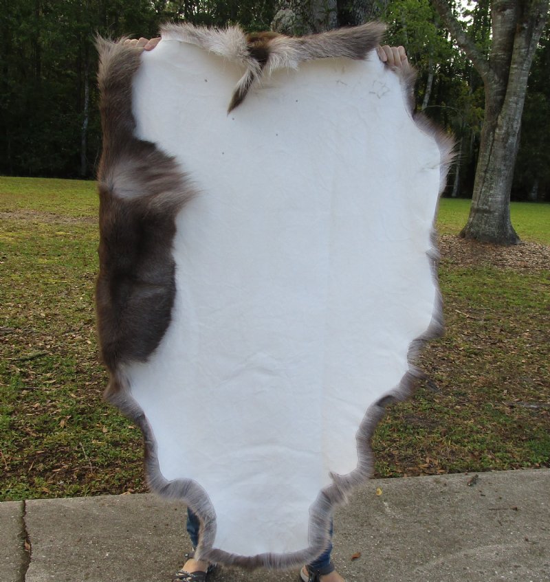 This is an authentic Reindeer Hide, Reindeer Fur and Reindeer Skin without legs, sourced from Finland's farming industry.  The fur has a blend of tans grays and whites and measures approximately 46-1/2 inches long and 37 inches wide.   This is a real reindeer hide, fur - NOT faux, imitation skin.  It is a Grade B Hide.  It has a couple slices in the fur. Our Grade B reindeer hides, reindeer skins and reindeer furs without legs are professionally tanned and imported from Finland. The legs have been trimmed off. Reindeer hides and reindeer furs are a natural and comfortable product. They should not be walked or stepped on, to prevent shedding and breaking of the fur. Reindeer skins and hides should be cleaned once a year with a standard vacuum on the lowest power.