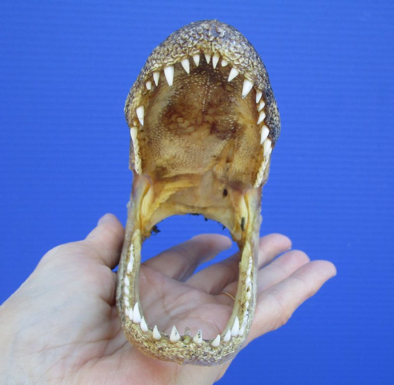 A taxidermy process cures the alligator skin and the alligator skull so it will be preserved for years.  Alligators have between 74 and 80 teeth in their mouth at a time. As teeth wear down they are replaced. An alligator can go through 2,000 to 3,000 teeth in a lifetime.
