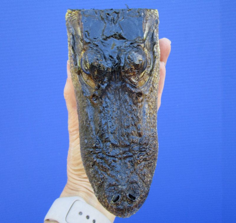 Small American Alligator Head Souvenir from a Louisiana gator.   This small alligator head measures approximately 5-1/2 inches long and 2-3/4 inches wide.  It is from an estimated 3 foot gator.  Our gator heads have clear or opaque glass eyes and the open backs of the heads have been painted black.  You are buying the one pictured.  Review all photos carefully.