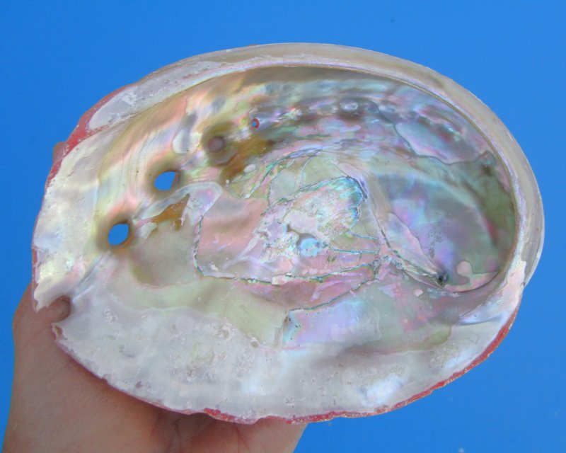 One Natural Red Abalone Seashell for Sale, Haliotis rufescens, measuring approximately 5-15/16 inches wide and 4-1/2 inches high. It is 100% Real - Not a Replica. It will have natural imperfections from living in the oceans and aging. Carefully review all photos as you are buying the one pictured. . Red Abalone is a species of large edible sea snails. The exterior of this shell has tones of deep red and green. The inside of the shell is strongly iridescent with shades of deep blues, greens, silver and mother of pearl.