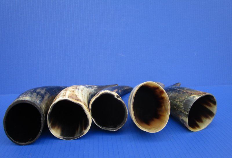 Five Sanded Cow Horns with a Rustic, Hand Scraped Look and a semi-polished finish.   These sanded and semi-polished cow horns with a hand scraped look measure between 9-1/2 inches and 11-3/4 inches,  measured around the curve of the horn using a cloth tape measure -- NOT straight with a wood ruler.  These are Real Water Buffalo Horns - Not Replicas They will have natural imperfections.  Our cow horns with a rustic look and a semi-polished exterior, will vary in coloring, size and shape.  No 2 will be identical. The bone core has been removed and the exterior of the horns have been semi-polished, but will still have some sections with a rough feel and the exterior has a hand scraped natural look.  Some of these horns may have a tiny patch at the tip of the horn where a tiny hole was drilled to release the pressure and allow removal of the inner bone. Raw Buffalo horns vary in coloring, size and shape and are used for making animal horn jewelry, in cabin decor, rustic decorating, in making knife and cane handles, for carving, in the art of scrimshaw and in making inlaid instruments.