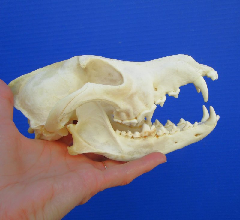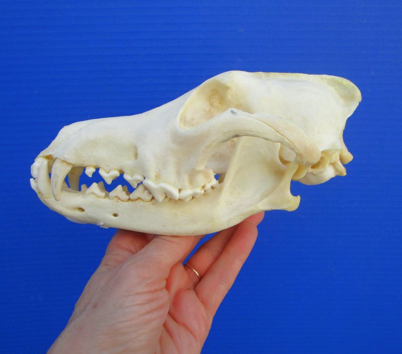 Genuine Coyote Skull (visible glue on bottom jaw), measuring approximately 7-3/4 inches long by inches wide. - Review all photos. You are buying this skull. This is a Real Coyote Skull - Not a Replica It has been cleaned but not fully whitened and will have some patches of discoloration.  It is from a wild North American coyote and will have natural imperfections from the animal living in the wild, fighting and aging.