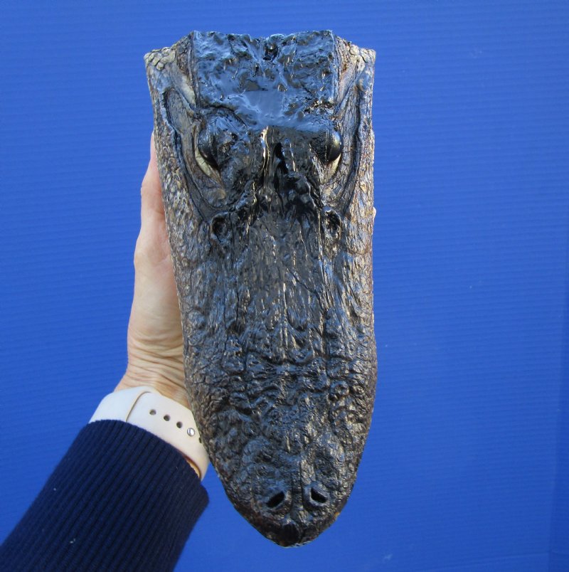 American Alligator Head from a farmed Louisiana gator.   This alligator head measures approximately 8-1/4 inches long and 4-1/4 inches wide.  It is from an estimated 5-foot gator.  Our gator heads have clear or opaque glass eyes and the open backs of the heads have been painted black.  You are buying the one pictured.  Review all photos carefully.