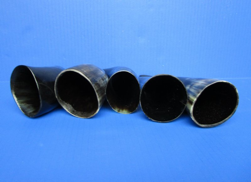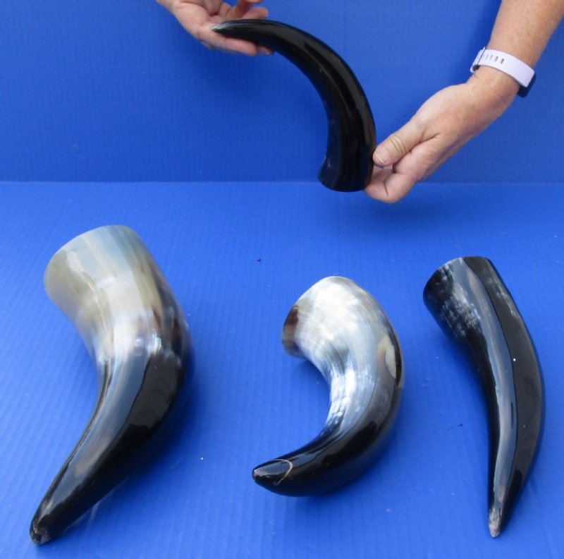 Polished Cow Horns for sale, imported from India. Some will stand unsupported while other will not.  These polished cow and ox horns will measure between 8 inches and 11-7/8 inches, measured around the curve of the horn using a cloth tape measure - NOT straight with a wood ruler.  The exterior of the horn is  polished. The interior of the horns is not polished.  Polished Ox and Cow Horns vary in coloring, size and shape  and have a marbleized appearance.  They are used in home decor , horn carving and horn crafts.  Some of these horns have a tiny hole drilled at the tip to release the pressure and allow removal of the inner bone.  These are real cow and ox horns - not replicas They will have minor natural imperfections.