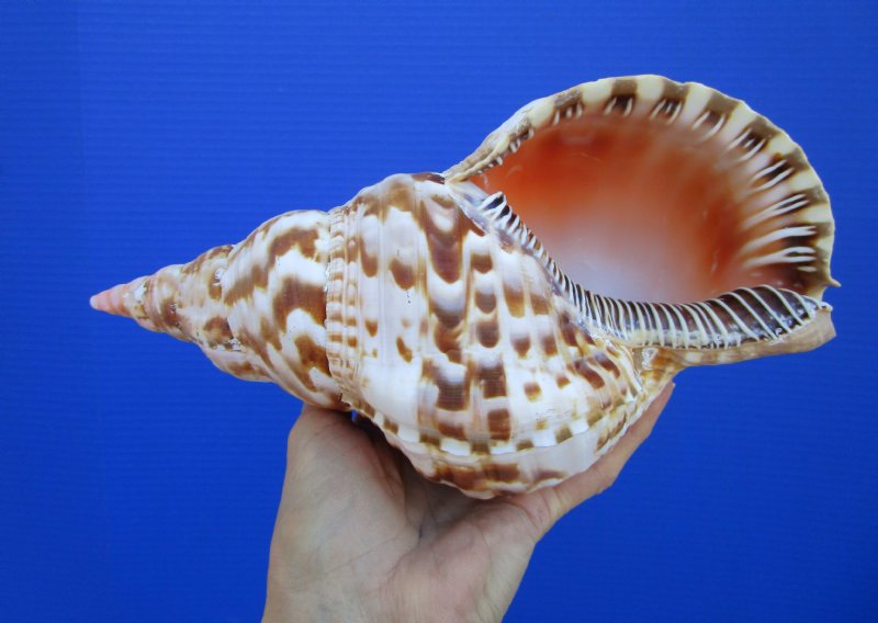 Atlantic triton trumpet shell, with an orange mouth opening,  Charonia variegata.  This Atlantic Triton's Trumpet shell is a large decorative shell and measures approximately 9-7/8 inches long and 5-1/2 inches wide. Atlantic triton trumpet shells have a wide mouth opening and are predominately a rich brown color. Tritons are from the family "Cymatidae". Their shells are mostly thick and solid and are found in the waters in Southeast Florida, the West Indies and Mediterranean.