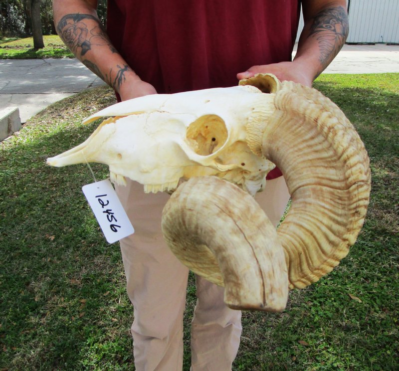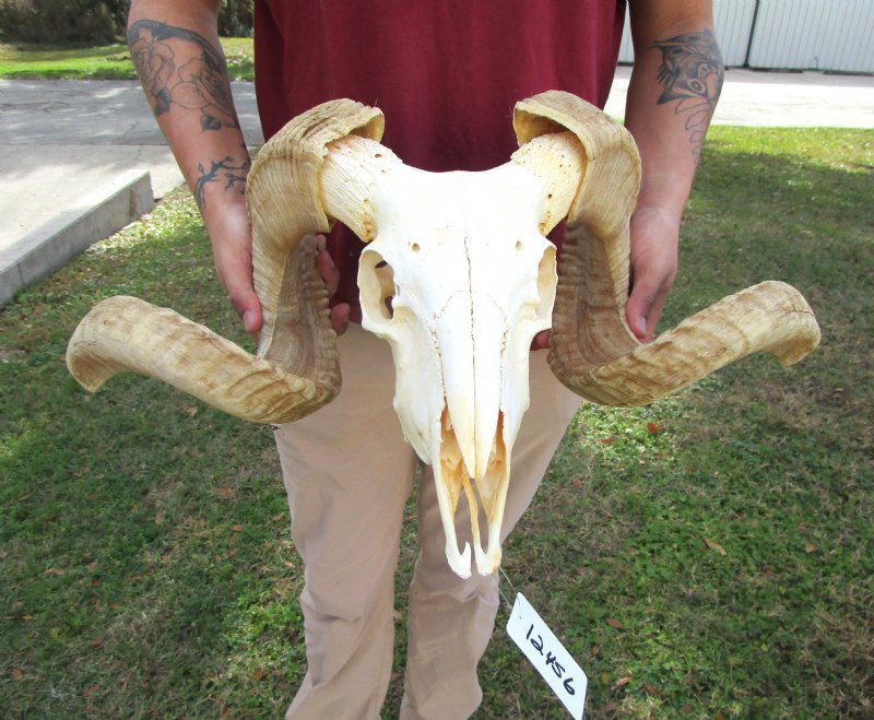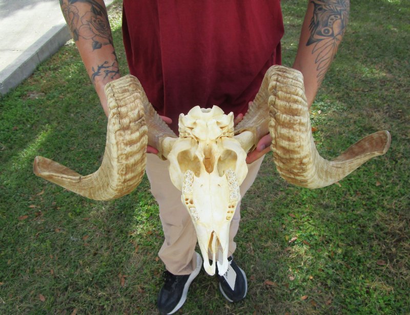 Discount Grade B African Merino Ram Skull, Merino Sheep Skull and Horns for Sale,  Ovis aries.  The sheep horns measure approximately 25 inches long, measured around the curl of the horns and the skull measures approximately 11 inches long. (Missing several teeth; horns don't go down all the way to the skull plate. Review all photos carefully).  The horns are removed for shipping.  They can easily be re-attached. These horns do not fit all the way down onto the skull. This is a Real Ram/Sheep Skull - Not a Replica. . It will have natural imperfections from the animal living in the wild, fighting and aging.  This Merino ram/sheep skull was imported from Africa and cleared for legal entry into the U.S. by the U.S. Fish and Wildlife Department and U.S. Customs Department.