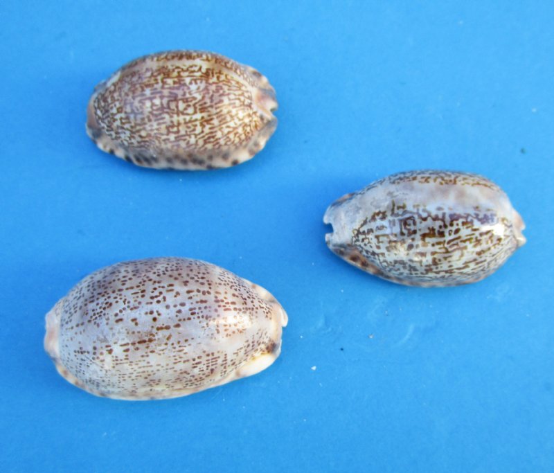 Arabian Cowry Shells for sale in bulk, Cypraea arabica, , measuring between 2 inches and 2-1/2 inches (some may be slightly larger or smaller). This Arabian cowry shell is oblong in shape with a very narrow and long mouth opening with small reddish brown teeth outlining it. The surface of the Arabian cowrie is shiny and appears purposely polished. The color is cream to light tan with shades of brown with irregular patterns.