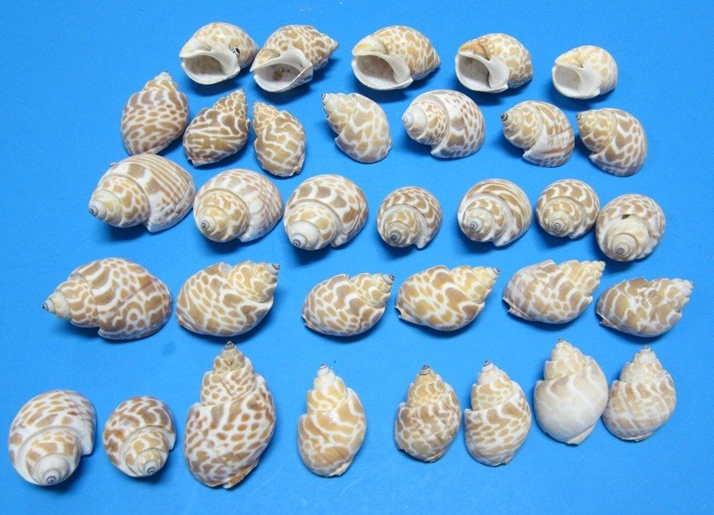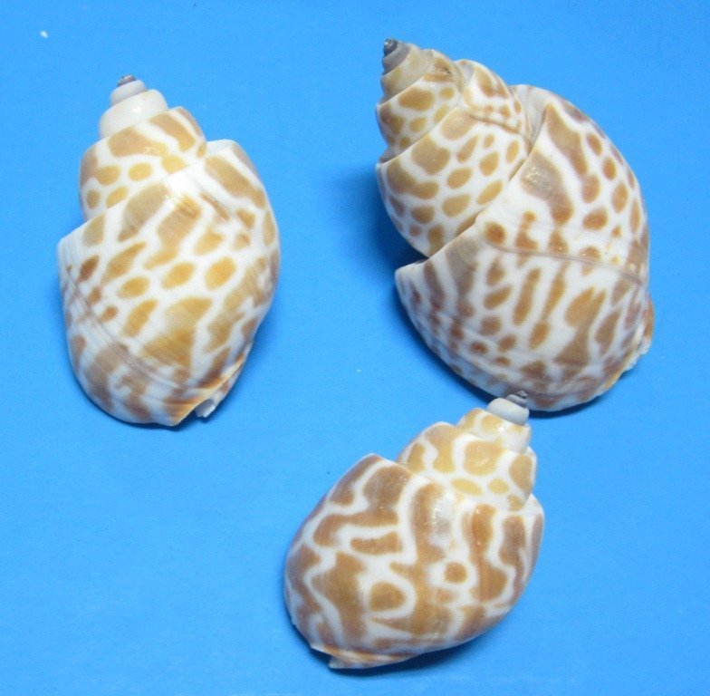 Babylonia Spirata Shells for Hermit Crabs, and small seashells for crafts with interesting patterns. Babylonia Spirata is a sea snail in the family Babyloniidae.  They measure approximately 1-1/2 inches to 2 inches long.  They have a variety of orangy brown different shaped spots against a cream colored backgound. You may receive shells that are little under or over the size range listed.