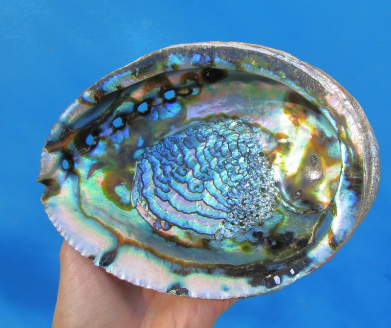Large Natural blue green abalone shell for display and smudging rituals, Haliotis fulgens.  It measures approximately 7 inches long and 5-1/2 inches wide.   The exterior of the shell is usually brown, marked with low, flat ribs, and the interior of the shell is iridescent blue and greens with black and silver accents.