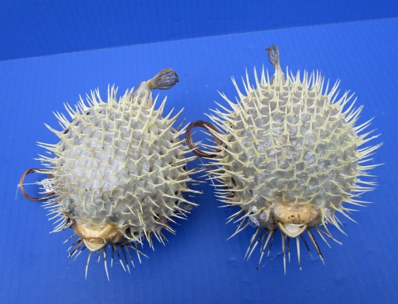 Two 5 to 6 inches long Preserved Dried Porcupine Fish for Sale or Porcupine Blowfish with sharp spines.   Each one has a hanger for easy display, fake wiggly eyes and a seam that runs the length of their body where the meat was removed. They are also also known as balloonfish or globefish.  Porcupine fish have heavy spines over their entire body. They inflate their body to increase their size as a defense mechanism.