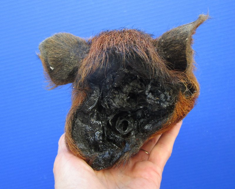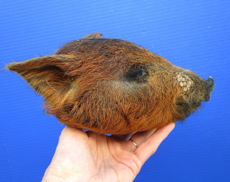 This is a Preserved Georgia Wild Boar Head with auburn colored fur.  The wild boar head measures approximately 8-1/4 inches long and 5 inches wide. measured from the nose to the end of the ears.    It will have an odor from the preserving agents used to preserve it that will subside over time. It is Real - Not a Replica.  The back of the head has been rough cut and painted black.