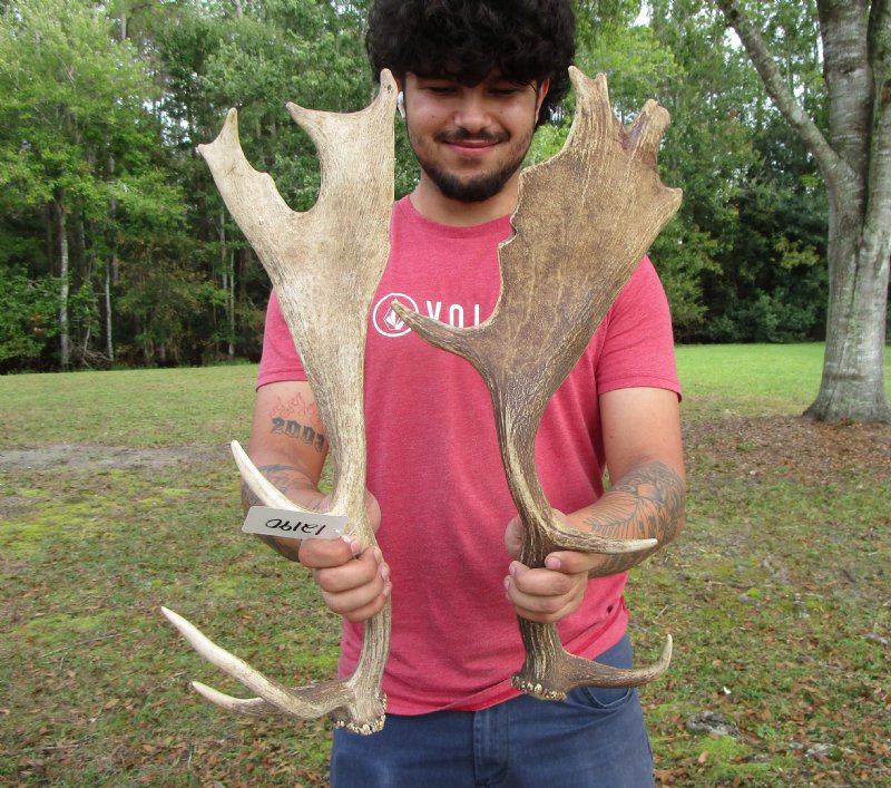 Two Fallow Deer Antlers for Sale for decorating and horn crafts.  One fallow deer antler measures approximately 22 inches tall and approximately 7 inches wide at the widest area on the horn and the other measures approximately 20-3/4 inches tall and 10-1/2 inches wide at the widest point. Measured with a wood ruler.  Use for decorating, painting, carving and scrimshaw art.  Fallow deer antlers are palmated and flattened just like a human palm.  During the summer months, bucks shed their antlers and grow fresh ones. Review all Photos.  You are buying the fallow deer antler pictured.  It is real - not a replica and will have natural imperfections from the animal living in the wild, aging and fighting.