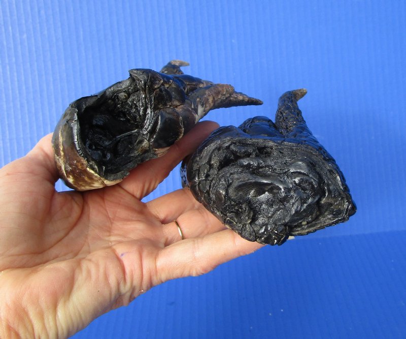 Two Preserved Florida alligator feet, ethically sourced from a Florida alligator farm. One alligator foot measures approximately 6 inches long and 4-3-/8 inches wide and the other measures approximately 5-1/4 inches long and 4 inches wide.  This preserved alligator foot is from a real Florida gator - Not a Replica.    It will have natural imperfections.  The bases are rough cut and painted black. The tops of the foot have been painted black and the bottoms of the feet have not been painted.   These feet will have an odor from the preservative used to preserve these feet and the clear gloss polyurethane sealant.  They will need to be aired out.