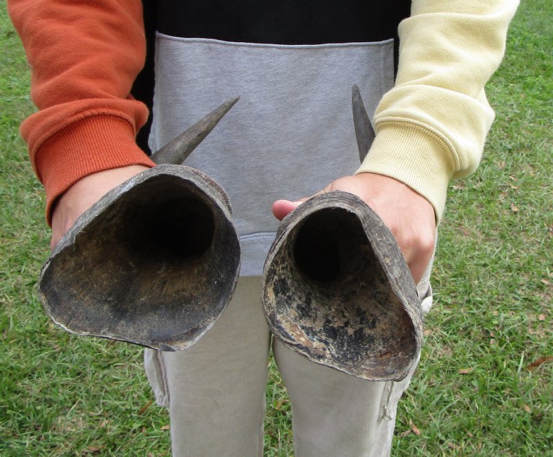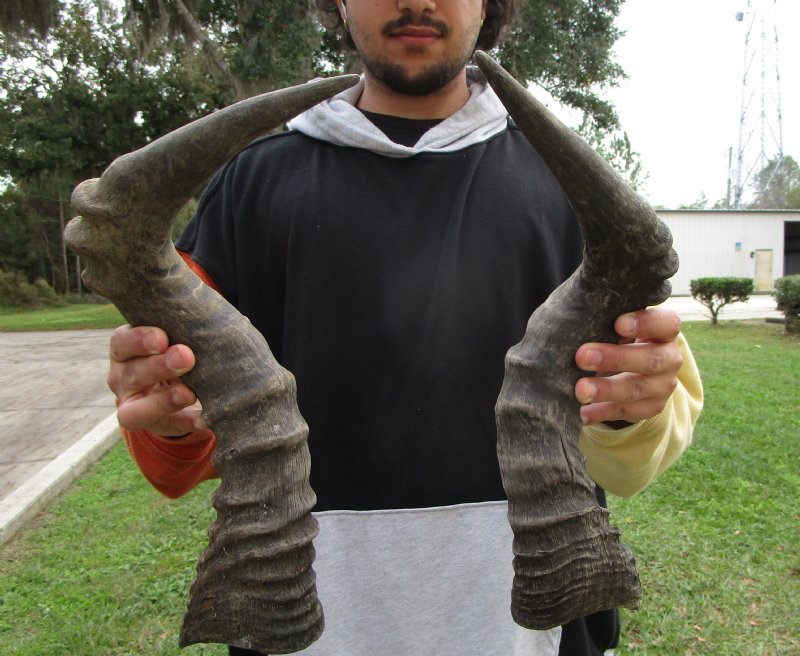 Two Single Male Red Hartebeest Horns for taxidermy crafts. One red hartebeest horn measures approximately 19 and the other measures approximately 21-1/2 inches (one right, one left), (measured around the curve of the horn using a cloth tape measure.  These horns are NOT A PAIR. These horns are 100% Real and will have natural imperfections from the animal living in the wild, fighting and aging. Review all photos carefully. You are buying the 2 horns pictured.