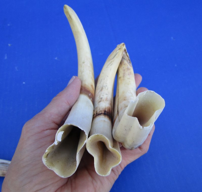 1.55 pounds (7 pieces) of warthog tusks for sale, hand picked out of our large inventory. These tusk measure approximately 7 to 8-3/4 inches.  These warthog tusks are used in taxidermy crafts.  They will vary in size.  These are real African warthog tusks NOT Replicas.  Some may have  cracks, gouges, and broken tips. REVIEW ALL PHOTOS.