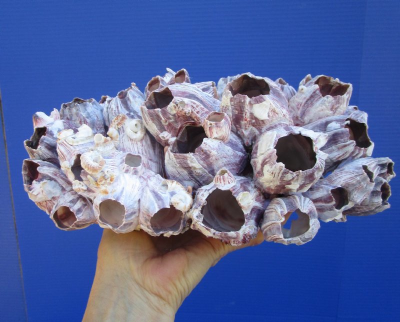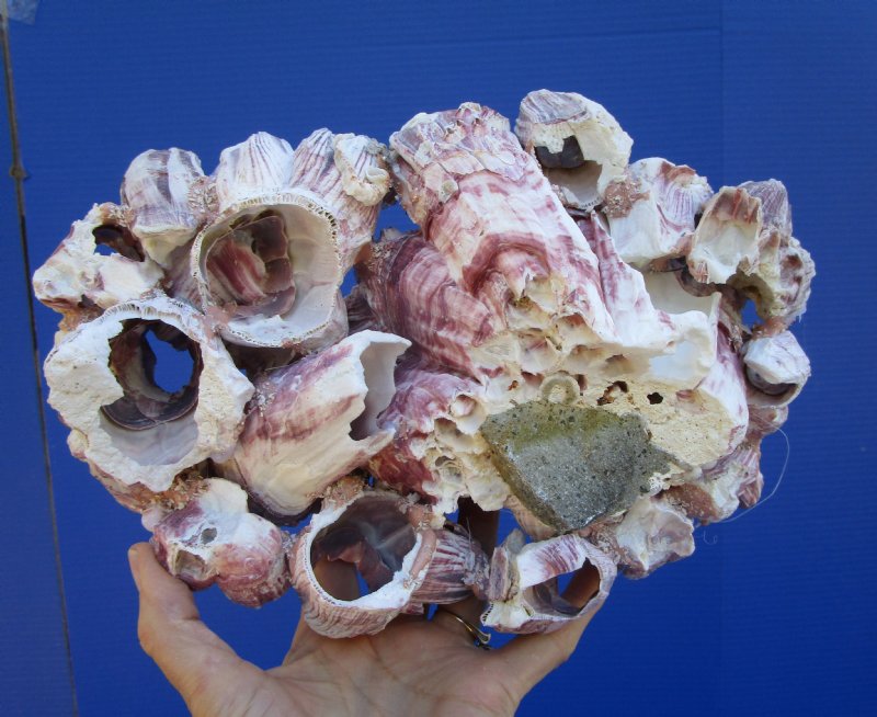 Large Purple Barnacle Cluster for Coastal Decor, measuring approximately 10-1/4 inches long, 7-1/4 inches wide.  No two will be identical.  Purple Barnacles will vary greatly in shape, size and shading. These large barnacle clusters are created by gluing smaller barnacles together. Our supplier uses a PINK colored glue and it will be visible in spots on the cluster.   Large barnacles are used in seashell decor, for displaying airplants and are an excellent hiding place for small fish and are a colorful accent to the fish tank; However, a salt water fish expert must be consulted for details on how to introduce barnacles into a tank.