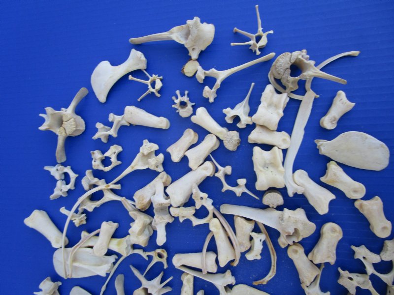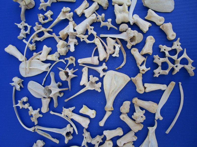 100 assorted animal bones, small thru medium including real raccoon bones for sale, real opossum bones for crafts and small wild boar bones including small and medium vertebrae bones, foot bones, toe bones, scapula bones, rib bones, leg bones and others.  These small and medium animal bones will measure between approximately 1 inch and 4 inches long (some are discolored), for making bone jewelry, carving bone and for bone art and crafts. These assorted animal bones are Real Bones - Not Replicas. Some have bits of dried cartilage on the bones.  They will have natural imperfections such as chipped edges, tiny cracks, etc., They have been cleaned and whitened; however, some may have a yellow tint.