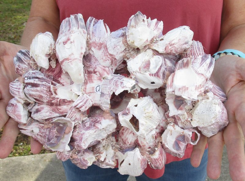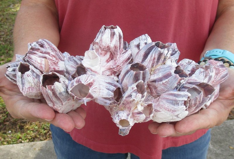 Large Purple Barnacle Cluster for Sale measuring approximately 11 inches long and 7-3/4 inches wide and 4-1/2 inches high.  No two will be identical.  Purple Barnacles will vary greatly in shape, size and shading. These large barnacle clusters are created by gluing smaller barnacles together. Our supplier uses a PINK colored glue and it will be visible in spots on the cluster.   Large barnacles are used in seashell decor, for displaying airplants and are an excellent hiding place for small fish and are a colorful accent to the fish tank; However, a salt water fish expert must be consulted for details on how to introduce barnacles into a tank.