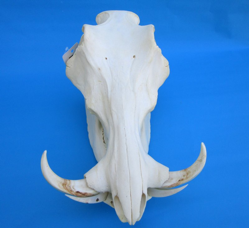 Large Warthog Skull for Sale with Ivory Top Tusks imported from South Africa. This large warthog skull measures approximately 14-1/2 inches long and 8-1/4 inches wide. The top tusks measure approximately 7-1/2 and 7-1/4 inches, measured around the curve of the tusks.  Missing some teeth. Review photos. You are buying this one.
