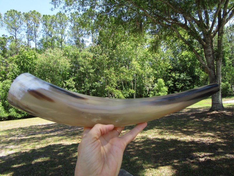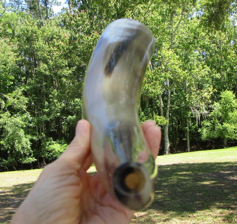 One Polished Blowing Horn for Sale, or Viking War Horn, made out of real ox and cow horns, polished to a shine.  It measures approximately 16 inches long, measured along the curve of the horn using a cloth tape measure.   Blowing Horns, or Viking War Horn, make a deep, rich sound when blown.  They are blown like a trumpet or shofar.  In the Viking age, a sounding horn, or blowing horn were used to warn of danger or to announce victory.  This blowing horn takes a bit of practice to use, but rewards those who are up to the challenge with the much deeper sound of a war horn. Today, that same horn is used to announce the beginning of every NFL Vikings football game.  Complete your Viking artifact collection with your own Sounding horn so you can root for your team or announce your arrival in style.