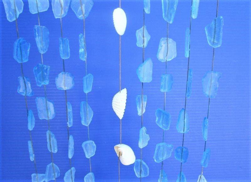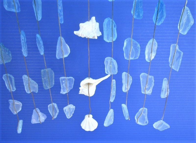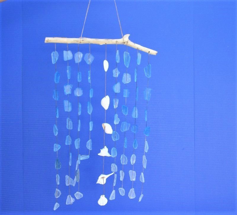Case of 20 Wholesale Hanging Blue Sea Glass with White Seashells on driftwood Wall Decor, Wind Chime measuring approximately 19 inches long and 11 inches wide (not counting the hanger).  Our Blue Sea Glass with White Shells hanging wall décor, wind chime is made with a driftwood branch and has 11 strands of hanging blue sea glass with a center strand of hanging assorted white seashells. There is a rope for easy hanging.