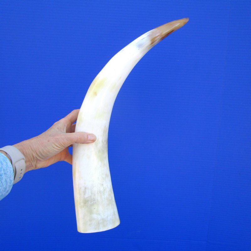 Polished White Cattle Horn, with a marble appearance, with a blend of tan, white and golden brown.  It measures between approximately 21-1/2 inches, measured around the curve of the horn using a cloth tape measureOur polished white cattle and cow horns for sale were imported from India.  This white polished water cattle horns will not stand unsupported. Buffalo horns vary in coloring, size and shape and are used for making animal horn jewelry, in cabin decor, rustic decor, as knife handle material and for cane handles, for carving, in the art of scrimshaw and in making inlaid instruments.