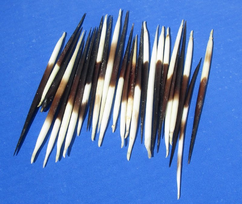 Thick Small African Porcupine Quills for sale for jewelry making and art and crafts.  These small porcupine quills, are black and white in color and will measure between 3 inches and approximately 4-7/8 inches long.  The quills are commercial grade, and have been cleaned, but may have some residue from the cleaning process on some of the quills. The bundle will contain some quills either below or above the size range mentioned. The thickness will vary within the bundle also. Quills are used in American Indian crafts.  These were sourced from the African Government's culling programs.