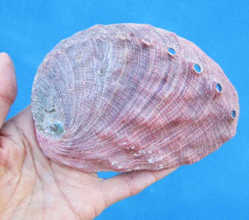 One Natural Red Abalone Seashell for Sale, Haliotis rufescens, measuring approximately 5 inches wide and 3-1/2 inches high. It is 100% Real - Not a Replica. It will have natural imperfections from living in the oceans and aging. Carefully review all photos as you are buying the one pictured. . Red Abalone is a species of large edible sea snails. The exterior of this shell has tones of deep red and green. The inside of the shell is strongly iridescent with shades of deep blues, greens, silver and mother of pearl.