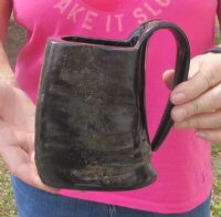 measured from the base of the mug to the top of the handle and will hold between 8 and 10 ounces of beer or soda, sepending upon the shape of the buffalo horn they were made out of..