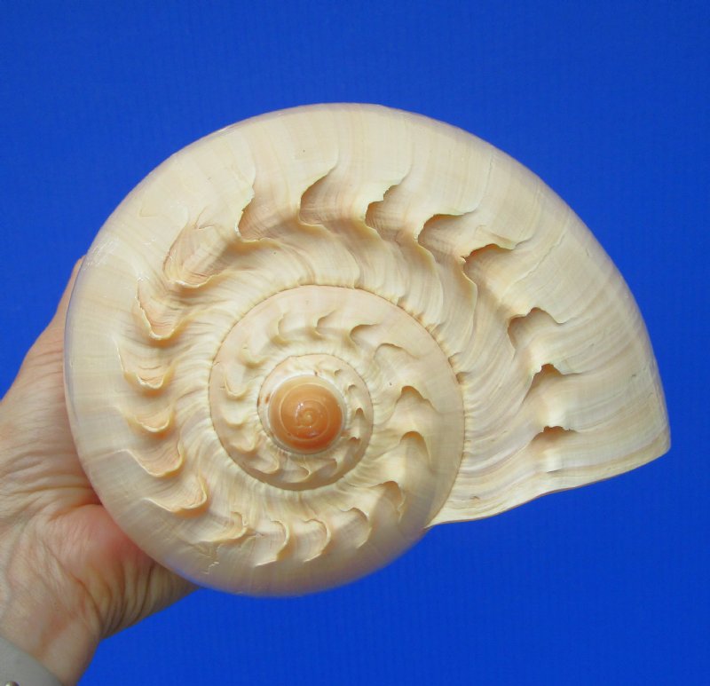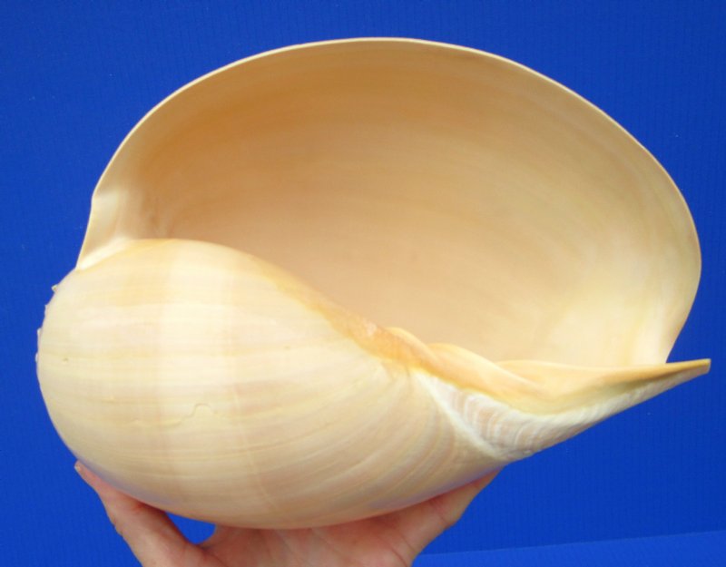 Crowned Baler Melon Shell for sale, melo aethiopica, measuring approximately 9-1/2 inches long and 7 inches wide. It is a large sea snail in the family Volutidae, the Volute.  This large crowned baler melon shell was imported from the Philippines. It has a wide mouth opening and can be used for making floral arrangements, for home decorating and would make a nice addition to a seashell collection.  They vary in color from orange to peach to dark tan-orange.  This is a Real Crowned Baler Shell - Not Imitation.  It is beautiful but will have natural imperfections from living in the oceans and the aging process.