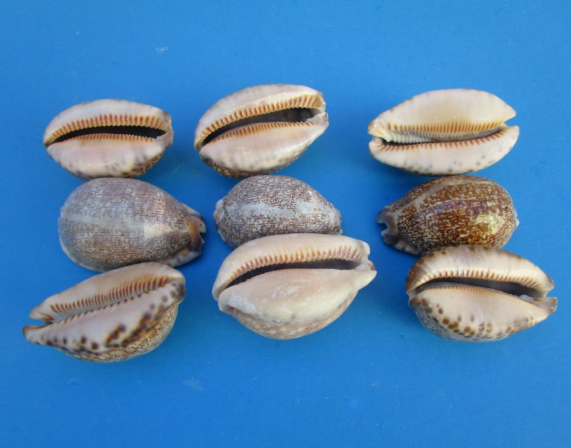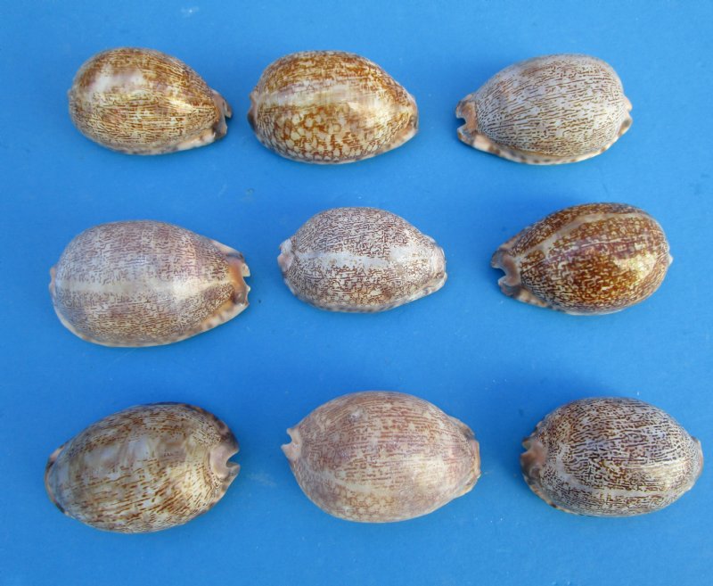 Arabian Cowry Shells for sale in bulk, Cypraea arabica, , measuring between 2-1/2 inches and 2-7/8 inches (some may be slightly larger or smaller). This Arabian cowry shell is oblong in shape with a very narrow and long mouth opening with small reddish brown teeth outlining it. The surface of the Arabian cowrie is shiny and appears purposely polished. The color is cream to light tan with shades of brown with irregular patterns.