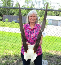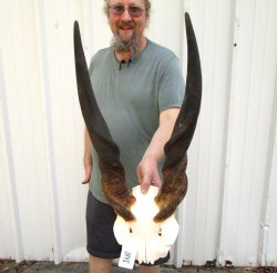 We have Common Eland Skulls for sale, Taurotragus oryx, the world's largest antelope found in the plains regions of East and Southern Africa. We carry both a male eland skull with horns and a female skull with horns. Both sexes have horns that spiral tightly; however, the female horns are longer and thinner. Our female eland skulls have horns measuring from 24 inches up to 29 inches. The male skulls have horns measuring from approximately 20 inches up to 25 inches. Full skulls and skull plates are available. We also have discounted skulls, with slight damage, for skull buyers on a budget. All of our skulls have been professionally cleaned and are ready for display. The horns are removed for shipping and can easily be re-attached.