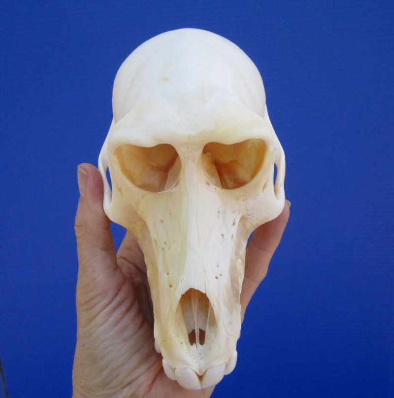 This is a Good Quality Authentic Female African Chacma Baboon Skull for Sale, Papio ursinus, measuring approximately 6-3/4 inches long and 3-1/2 inches wide. (Skull has a few patches of discoloration)