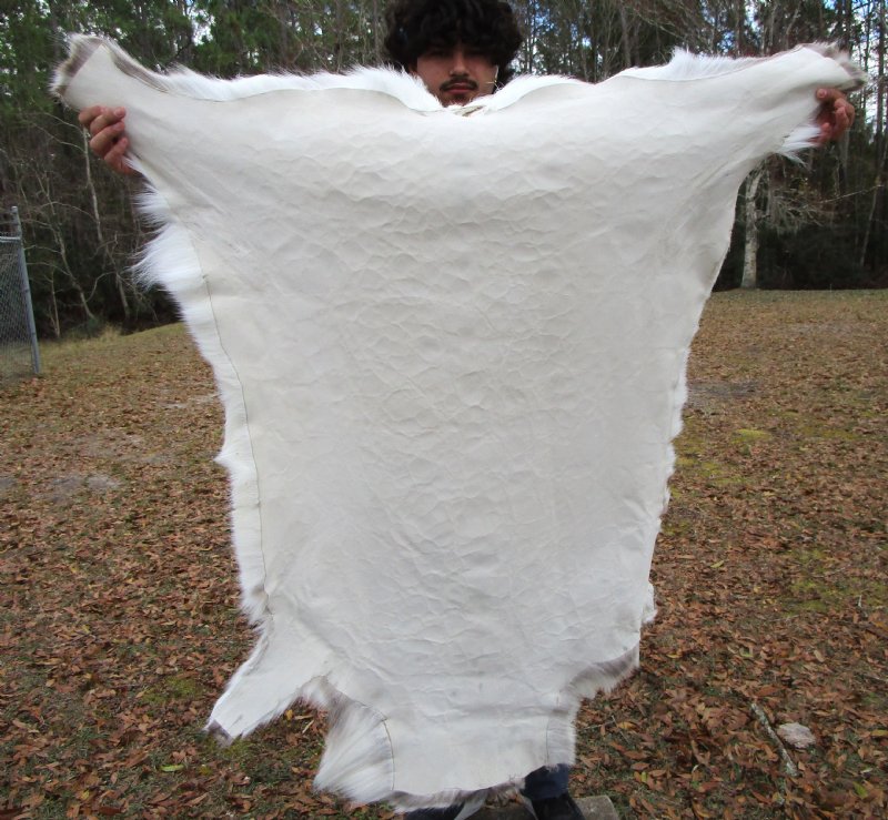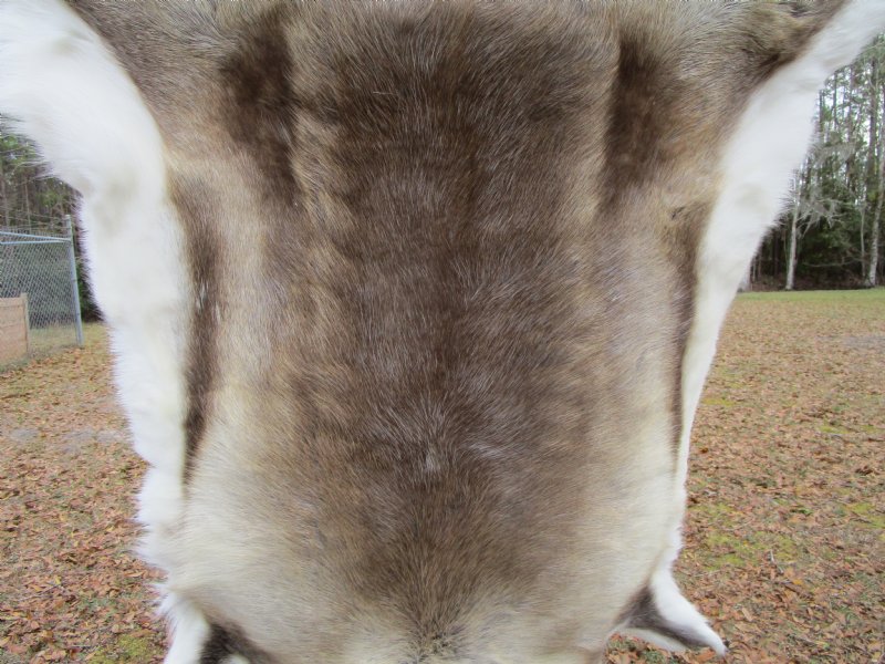 Reindeer Skin, Reindeer Hide, Reindeer Fur imported from Finland, Good Quality Standard Grade, with natural imperfections.  This reindeer skin, hide measures approximately 51 inches long and 45 inches wide and its fur has a blend of whites, brown and tans.