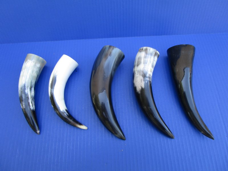 Five Polished Cow Horns for sale, imported from India.   You are buying the polished cow horns pictured,  Review all photos.  They will measure between 6-1/2 inches and 8-1/4 inches, measured around the curve of the horn using a cloth tape measure - NOT straight with a wood ruler.  The exterior of the horn is  polished. The interior of the horns is not polished.  Polished Ox and Cow Horns vary in coloring, size and shape  and have a marbleized appearance.  They are used in home decor, horn carving and horn crafts.    These are real cow and ox horns - not replicas They will have minor natural imperfections.