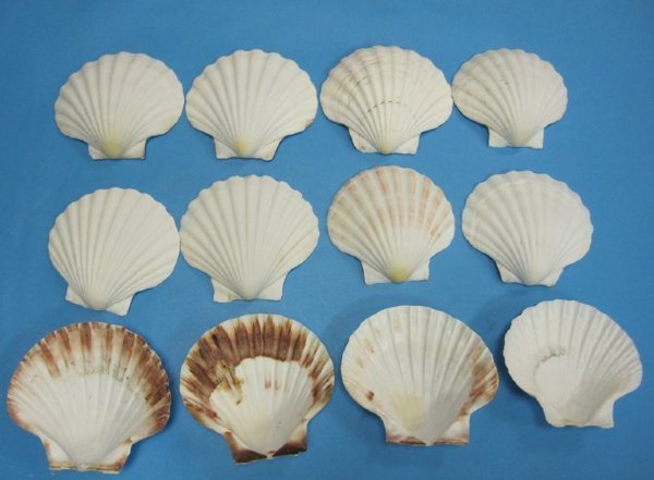 Great Scallop Baking Shells, imported from India, Pecten maximus, also called Great Scallop Shells or Irish Deep Shells. These Great Scallop Baking Shells measure approximately 4 inches to 4-3/4 inches in size. Large Great Scallop Shells are used in baking seafood and used to hold cocktail sauces, stuffed shrimp and scallops. Also used in making seashell angels. The Great Scallop is an edible shell.