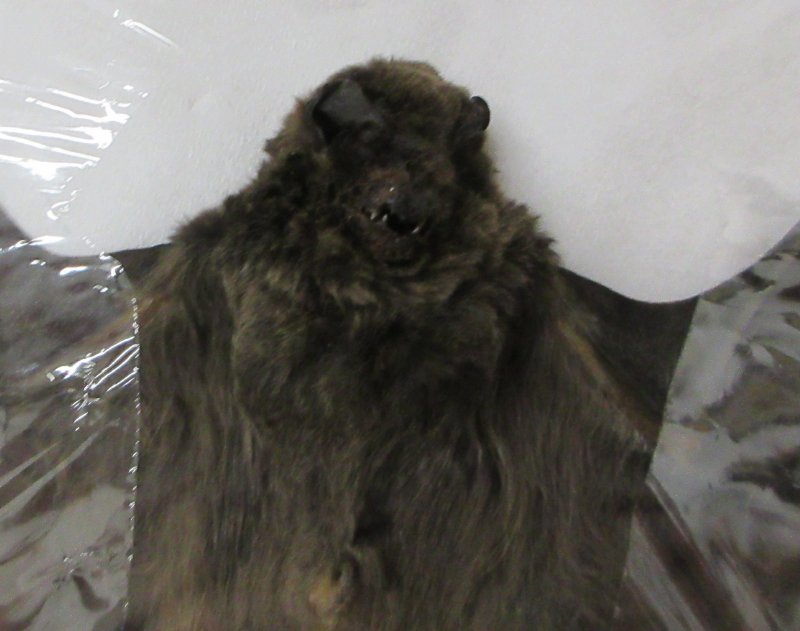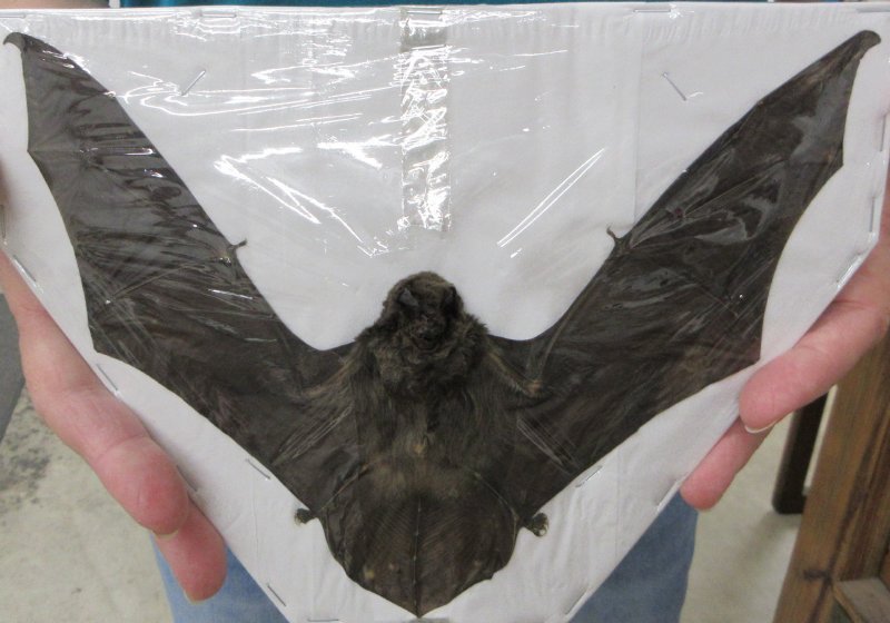 Mummfied Intermediate Long-Fingered Bat with Wings Spread in a flying position (miniopterus medius).  It measures approximately 8 to 9 inches wide.  It will have an odor from the mummification process and will need to air out.