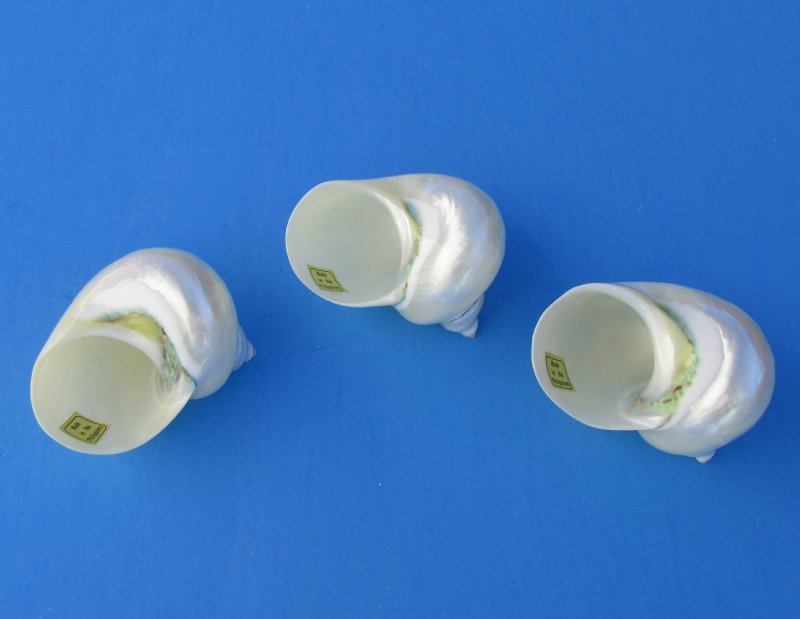 3-1/2 to 3-7/8 inches White Pearl Turbo Seashell for sale for decorating and large hermit crab changing shells. White seashells are used in beach wedding decorations and in glass containers, baskets and as an addition to a shell collection. They also make great homes for large hermit crabs. The outer layer of these turbo seashells has been removed with a chemically process which exposes the beautiful pearly white layer of the shell.   Our shells are real - not replicas.  They will have natural imperfections from living in the oceans and aging.  There will be a tag attached "Made in the Philippines". This is a requirement of the US Customs Department.
