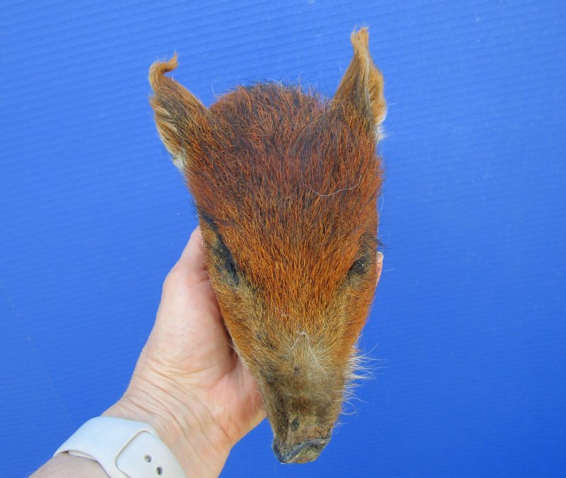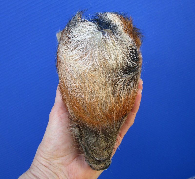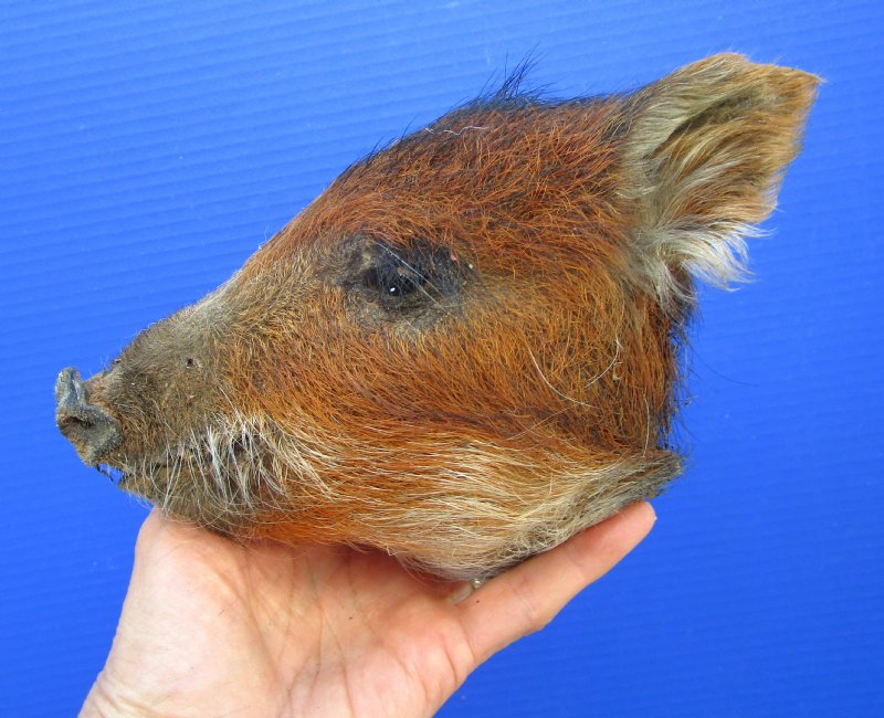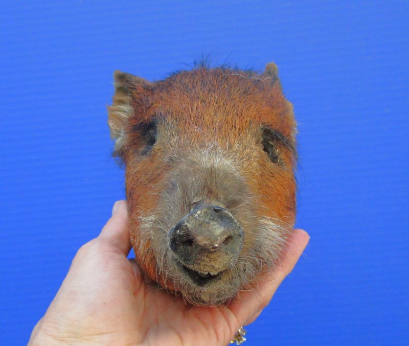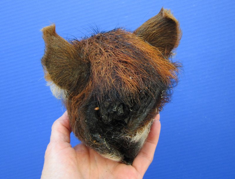 This is a Preserved Georgia Wild Boar Head with auburn colored fur.  The wild boar head measures approximately 6-3/4 inches long and 4-1/4 inches wide. measured from the nose to the end of the ears.    It will have an odor from the preserving agents used to preserve it that will subside over time. It is Real - Not a Replica.  The back of the head has been rough cut and painted black.
